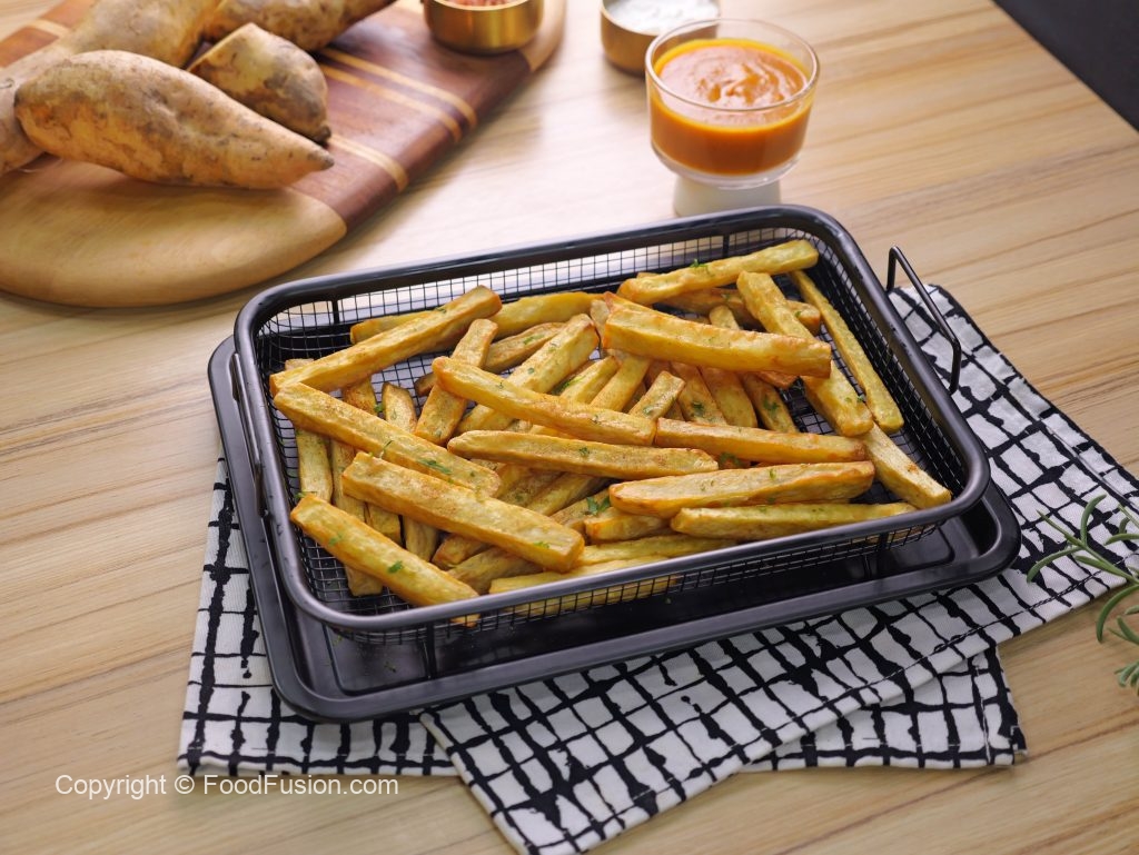 -Pehlay sweet potatoes chheel len, edges trim kar len aur batonette shape mein cut kar len. (Edges baad mein use ke liye reserve kar len)
