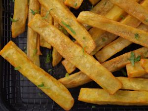 -Peel sweet potatoes, trim edges & cut in batonate. (Reserve edges for later use)