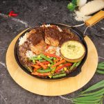 -Garlic fried rice,stir fried vegetables,creamy mashed potato,chicken fillets,garlic & pepper sauce dal ker serve karein!