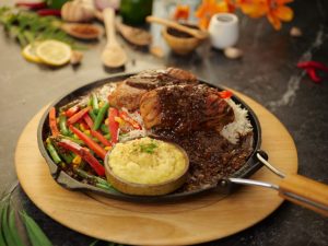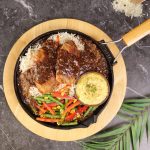 -Add garlic fried rice,stir fried vegetables,creamy mashed potato,chicken fillets,garlic & pepper sauce & serve!