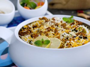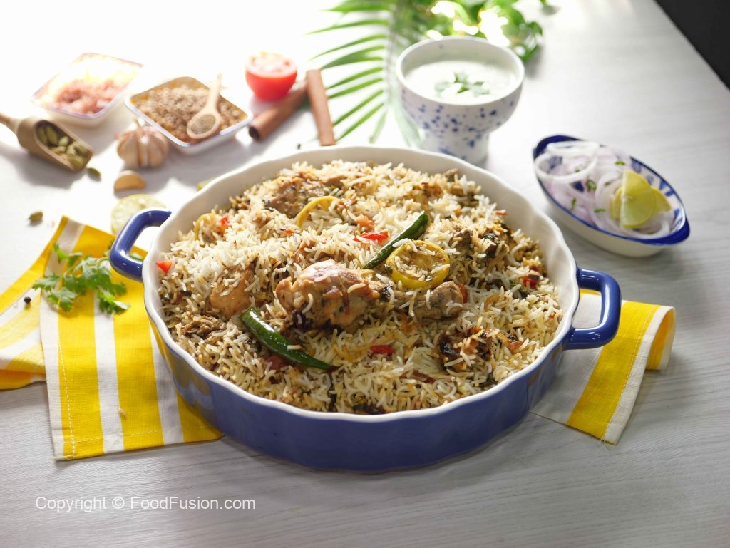 -Bowl mein fried pyaz,tamatar,hari mirch,lemon slices,aloo Bukhara,podina,hara dhania,zeera aur biryani masala dal ker ache tarhan mix karein & side per rakh dein.