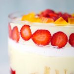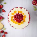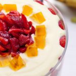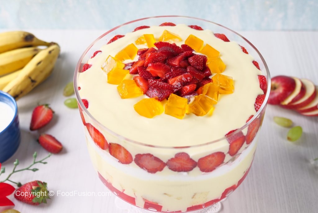 -In a trifle bowl,add red jelly cubes,plain cake cubes,sugar syrup,prepared custard,whipped cream, prepared mixed fruits,sugar coated strawberries & line the inner side of bowl with strawberry slices.