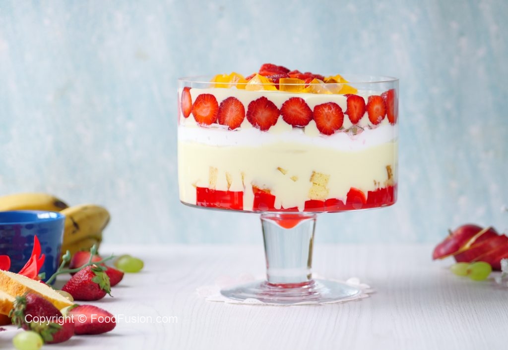 -Trifle bowl mein red jelly cubes,plain cake cubes,sugar syrup,tayyar custard,whipped cream,tayyar mixed fruits aur sugar coated strawberries dal ker bowl ki sides ker strawberry slices laga lein.