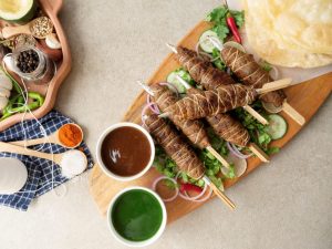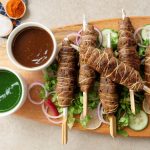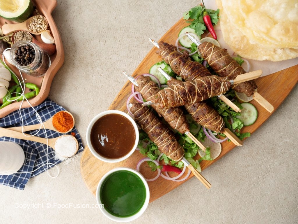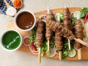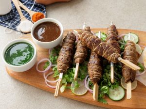 Haath geelay karein aur 75g mixture la ker wooden aur metal skewer per laga lein aur kitchen twine/thread sa bhand lein (makes 10-12).