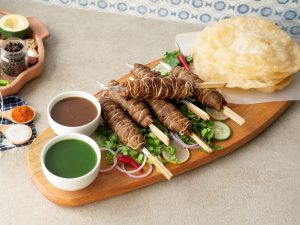 Wet hand with water,take a mixture (75g) and thread on wooden and metal skewers and tie with kitchen twine/thread (makes 10-12).
