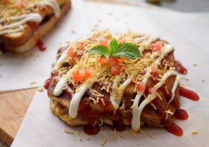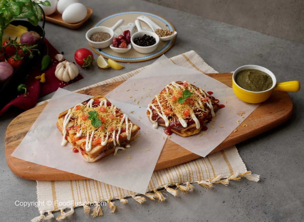 Cut sandwich into four pieces,drizzle tomato ketchup,mayonnaise,sev nimco,tomato & serve!