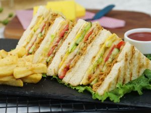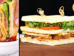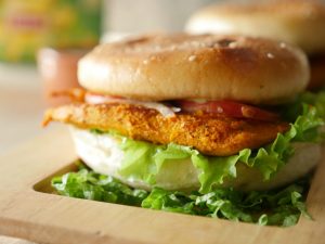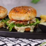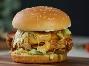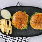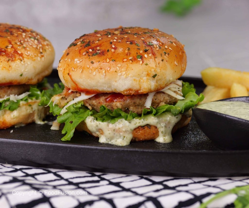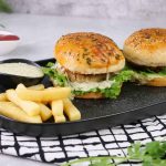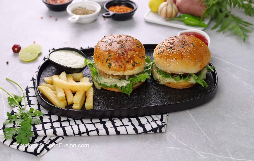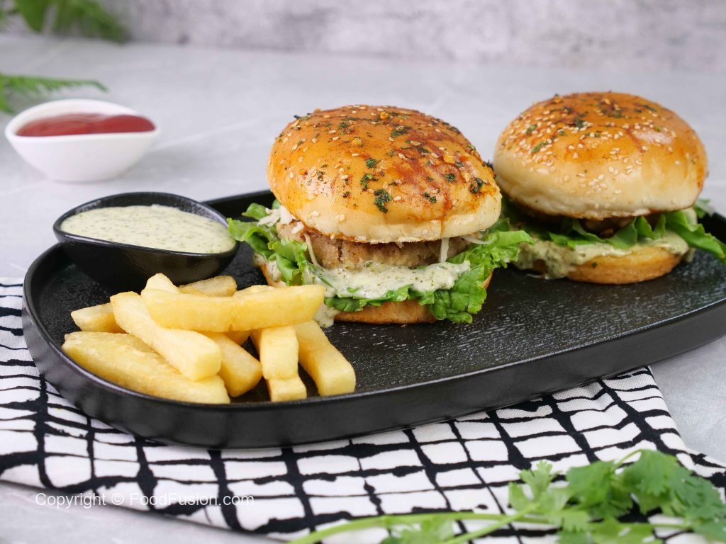 -On burger bun,add & spread prepared burger sauce,salad leaf,fried patty with cheese,tomato ketchup & cover with top bun to make a burger.