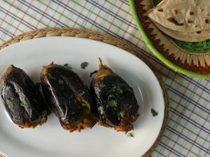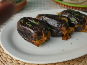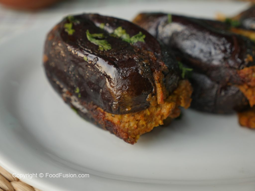In frying pan,add olive oil and place stuffed brinjals,cover and cook on low flame until done (approx. 25-30 minutes) and keep turning sides or flip to cook evenly.