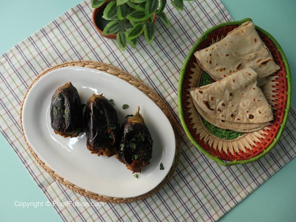 Baigan mein char slit laga lein aur tayyar mixture sa bhar dein.