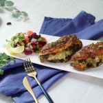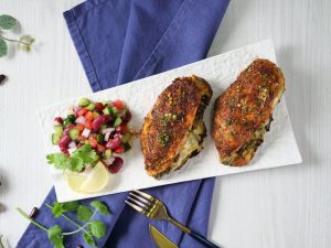 -Brush prepared garlic oil on top of stuffed chicken & insert toothpick or skewer to seal the stuffing.