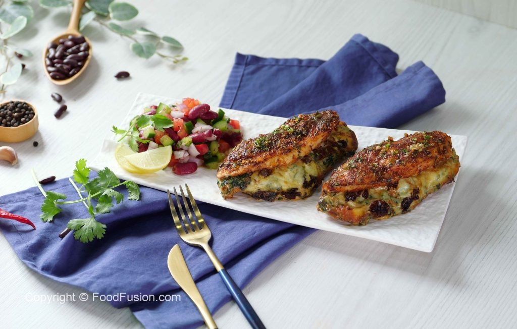 -Now add prepared cheesy creamed spinach on one side,mozzarella cheese,sun-dried tomatoes,fresh parsley & cover with other side of chicken fillet.