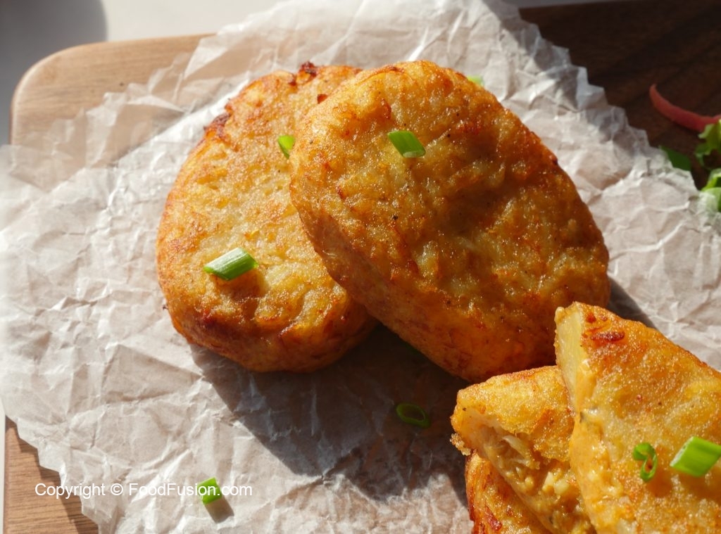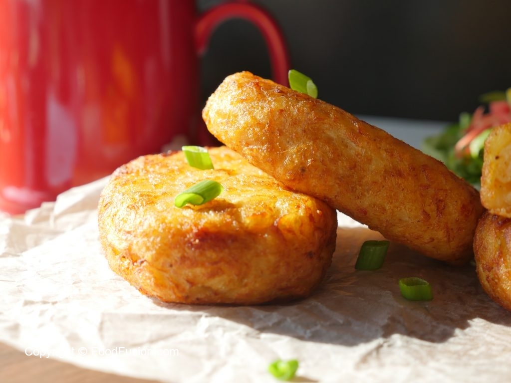 In a wok,heat cooking oil and fry hash brown until golden brown.