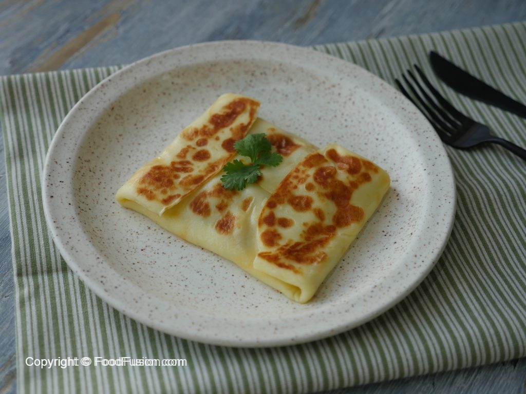 Turn off the flame,on prepared crepe,add cheese slice,chicken filling and fold all four sides carefully.