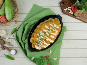 Serving dish mein fried stuffed lauki slices rakh dein aur uppers sa tayyar gravy pour ker lein.