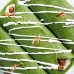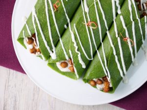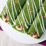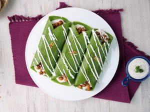 -Crepe per tayyar dahi sauce & tayyar spiced (masala) chickpea dal ker crepe ko fold ker lein.