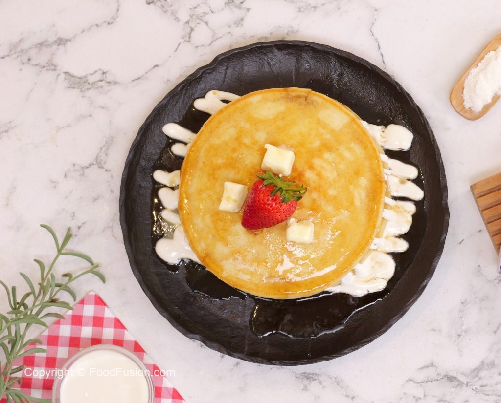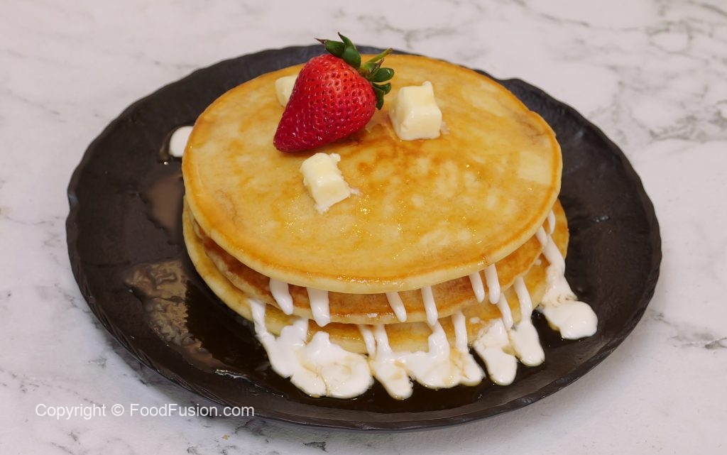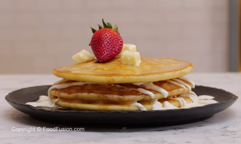 -Pancakes ka bech mein cream drizzle karein,makhan aur maple syrup dal ker serve karein!