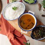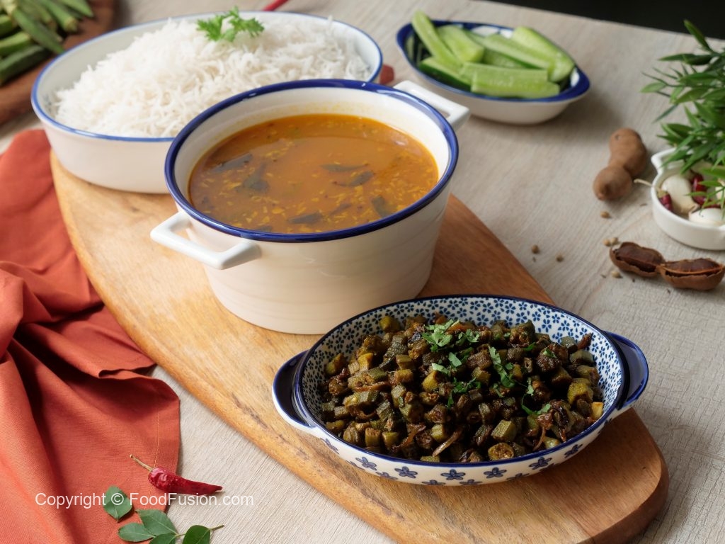 Serve tamatar ka khatta with bhindi ki sabzi & boiled rice.