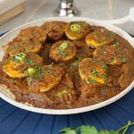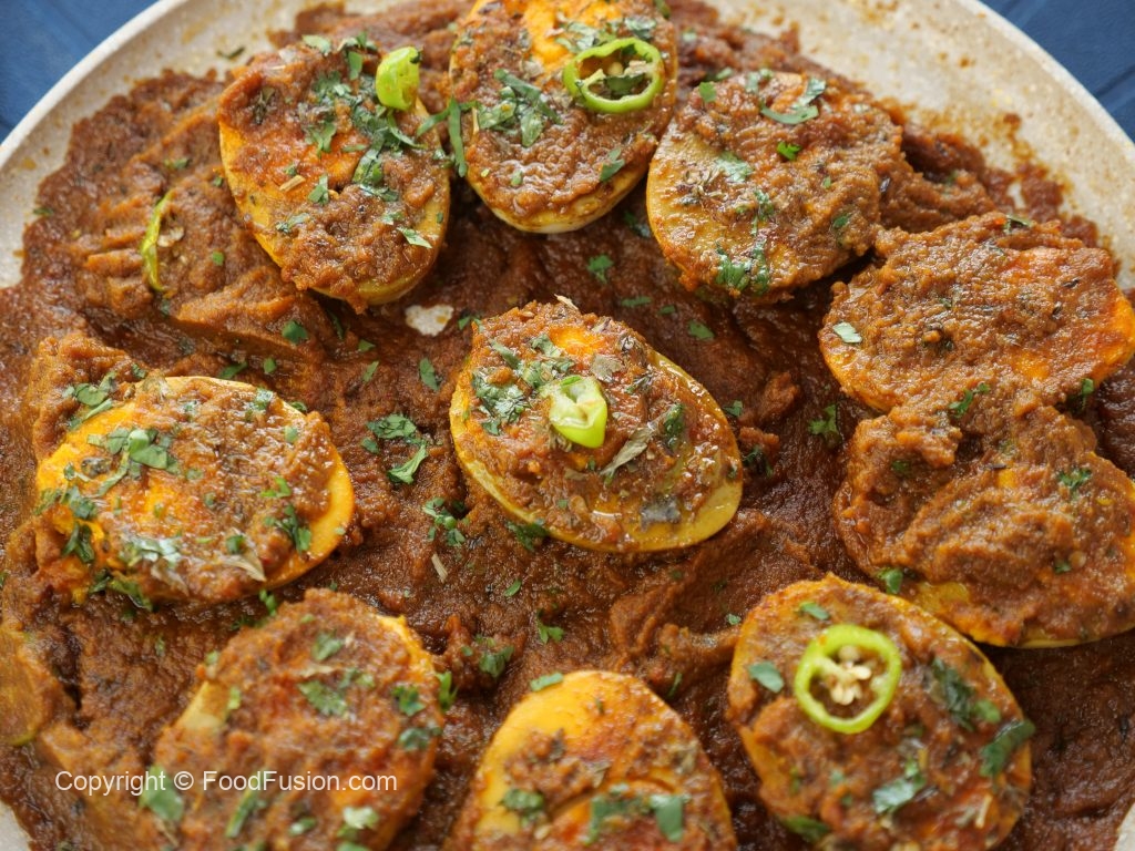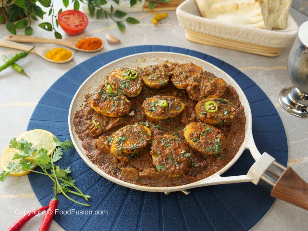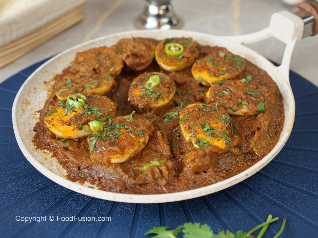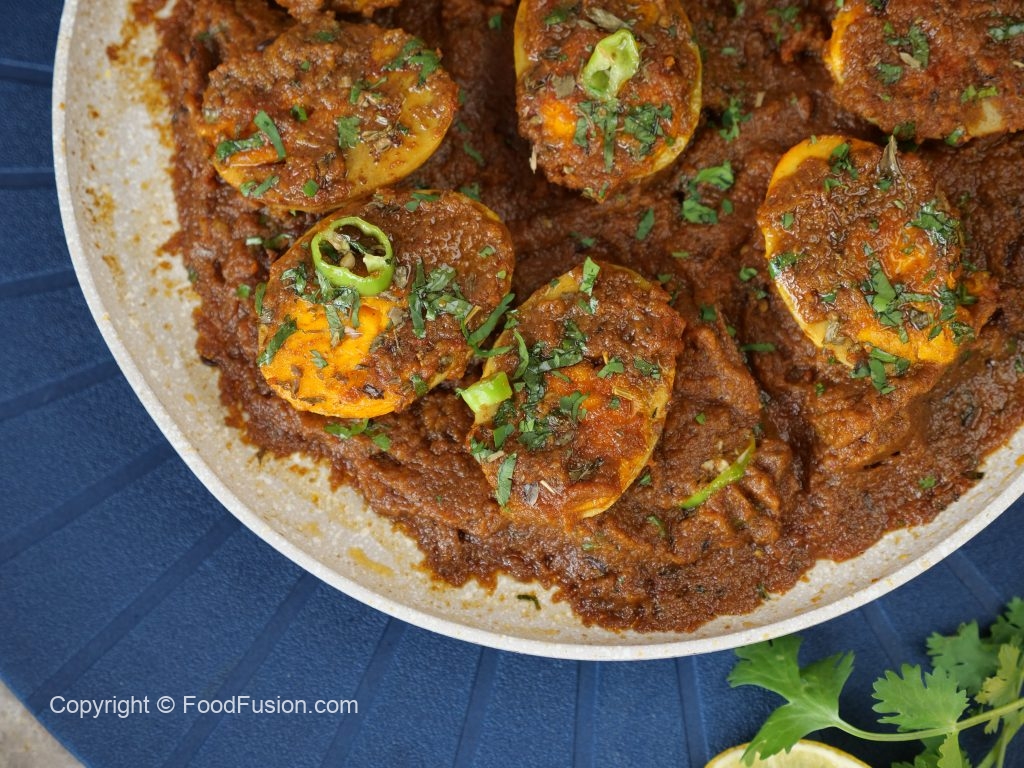 -Place eggs,cover with gravy,add water,green chillies,fresh coriander,dried fenugreek leaves,cover & steam cook for 3-4 minutes & serve!