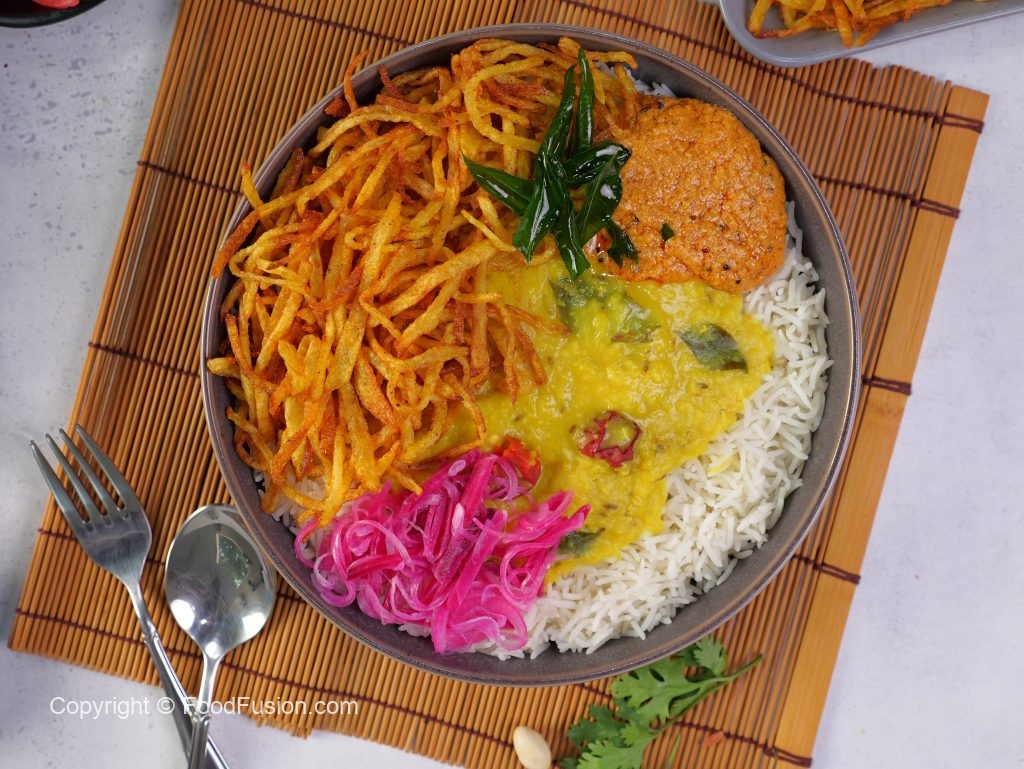 -In a serving bowl,add rice,daal,crispy aloo,prepared teekhi chutney,pickle onion,fried curry leaves & serve!
