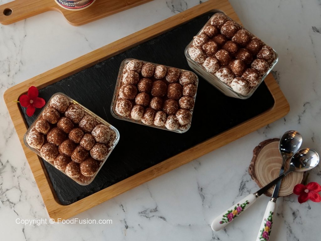 In serving cups,add a layer of prepared cheese & cream mixture,add coffee dipped biscuits one by one and add another layer of cheese & cream mixture,sprinkle cocoa powder on top.