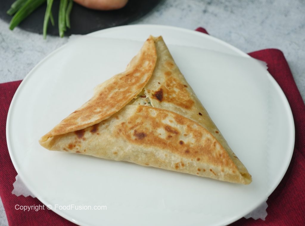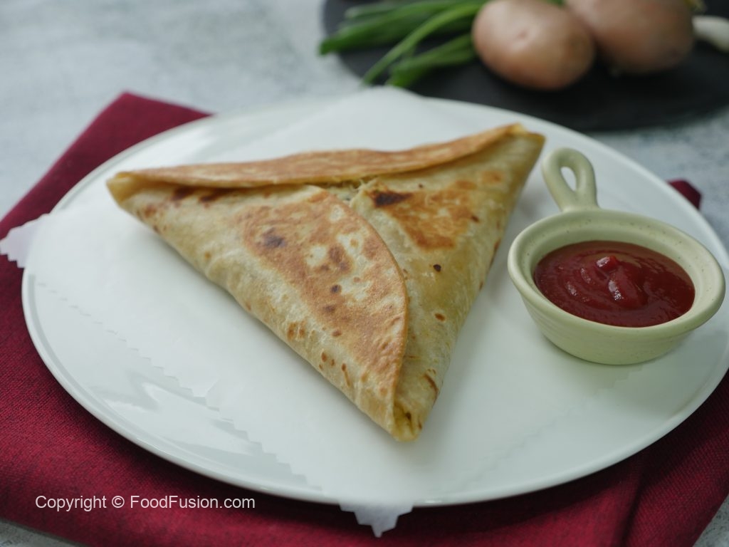 Tortilla ya roti ka upper aloo& chicken filling dal ker triangle shape mein pheela lein.