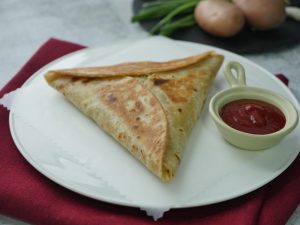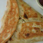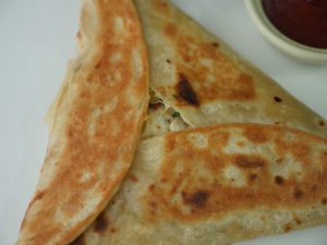 Add cheddar cheese and potato & chicken filling,fold & seal tortillas/roti to make a triangle (makes 6).