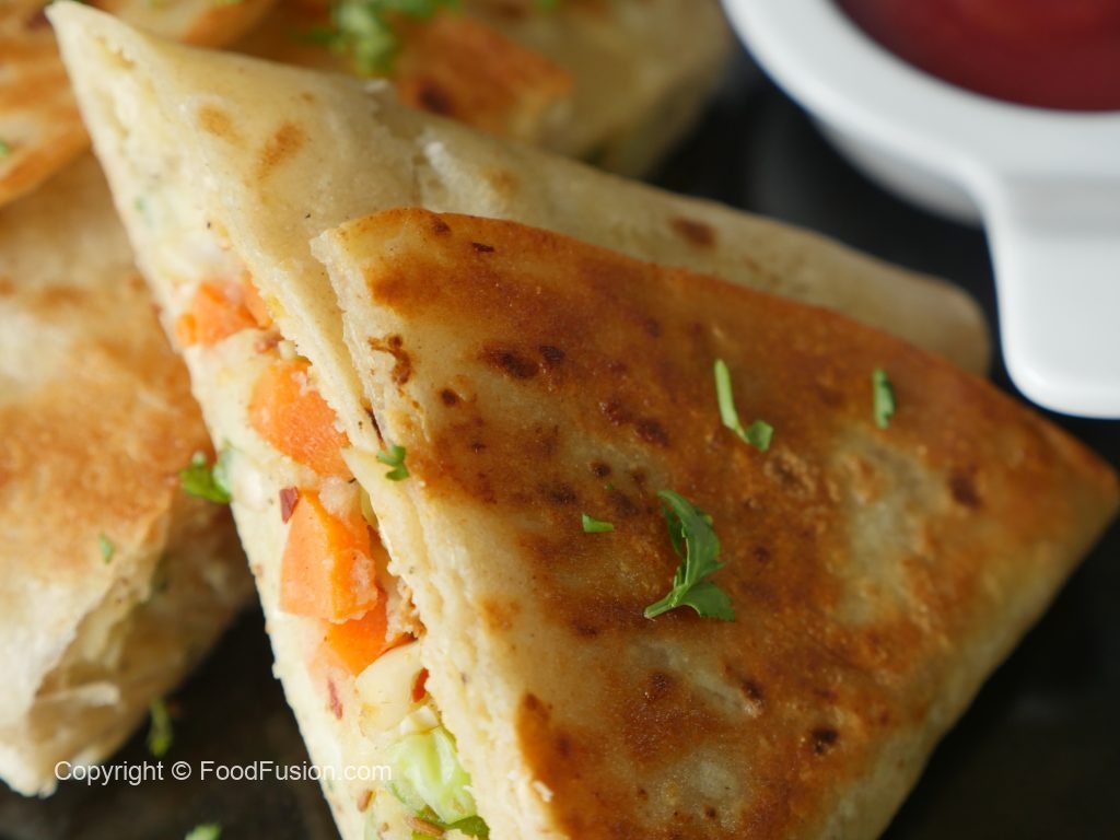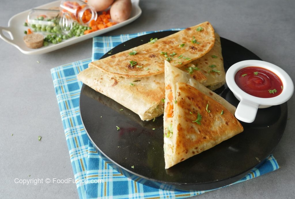 Add vegetable filling and fold tortillas/roti to make a triangle and seal with the help of potato filling (makes 2).