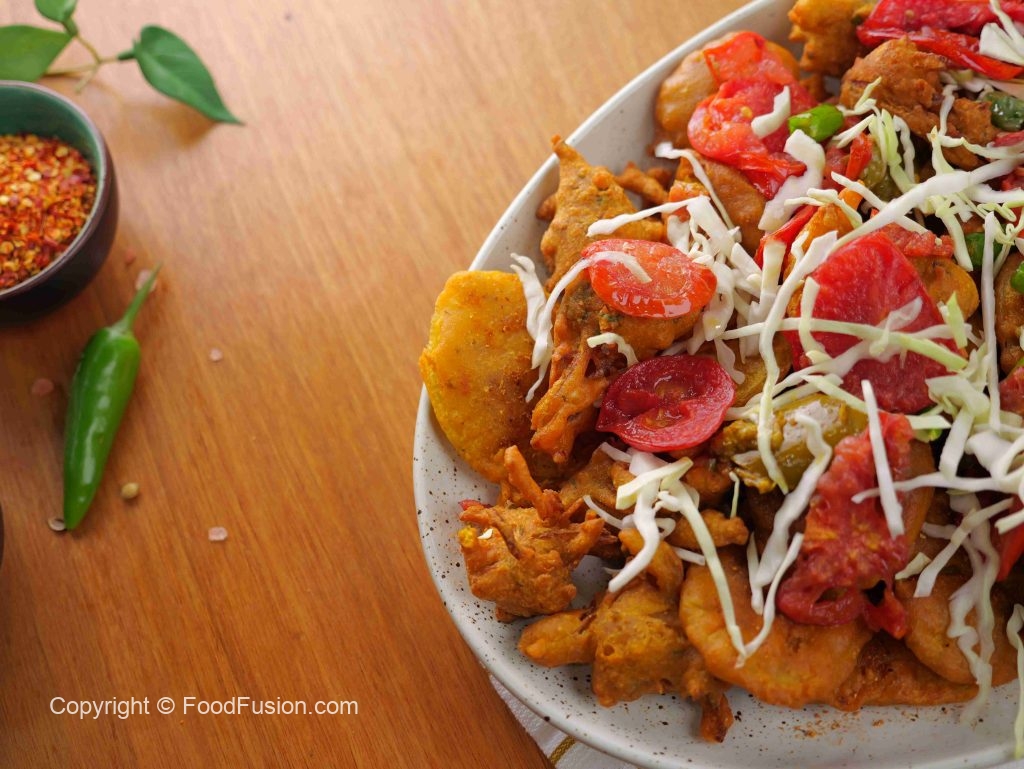 -In a serving platter, add fried pakoray, fried tomato & green chilli slices, pickle, garnish with cabbage & serve!