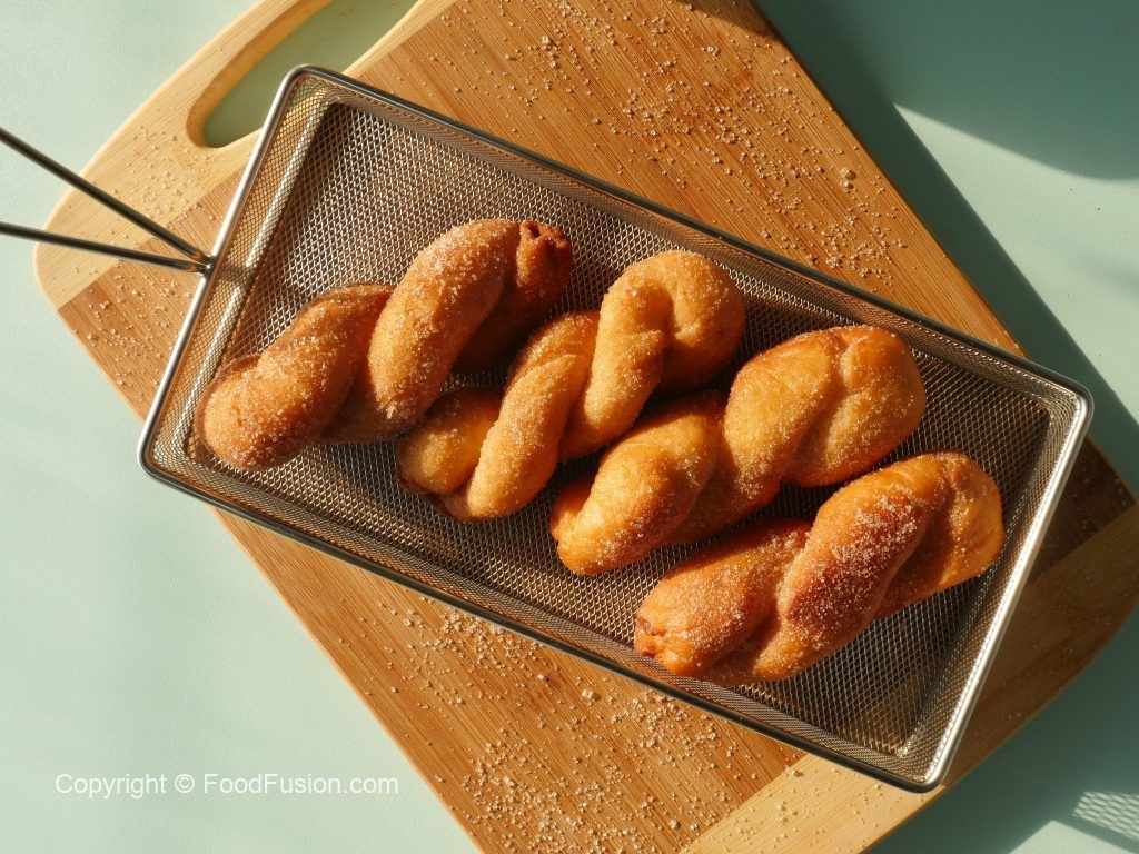 Chota dough lein aur working surface per roll ker lein (8 inch long aur ½ inch diameter).Agar dough sticky ho tou maida chirak dein aur roll ko dono sides sa twist ker ka rope ki tarhan bana lein makes 15-16).