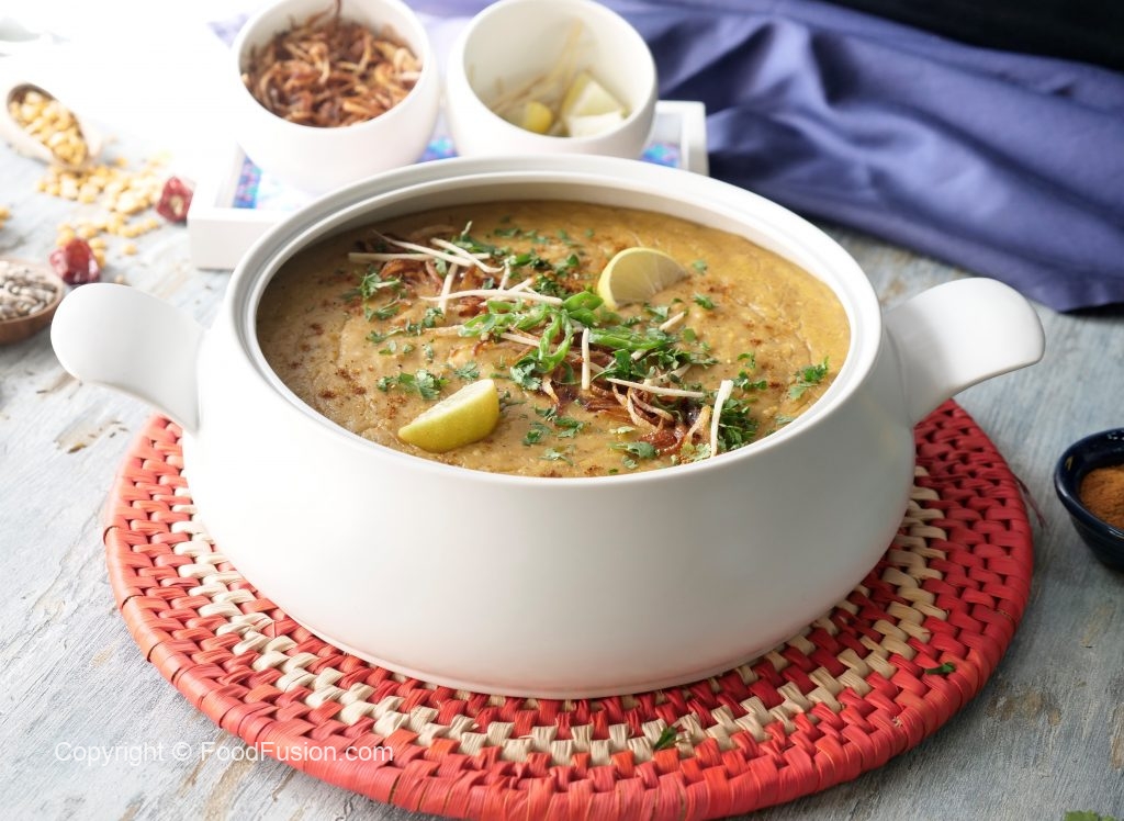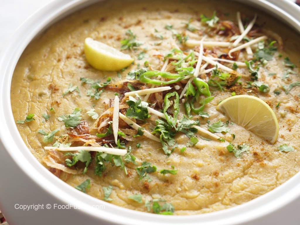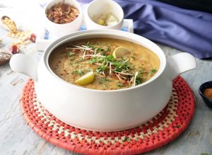 Dish out daleem & sprinkle fried onion, ginger, green chillies, fresh coriander, chaat masala,add lemon wedges & serve.