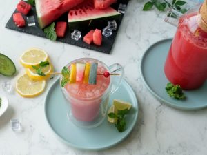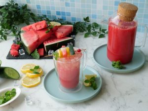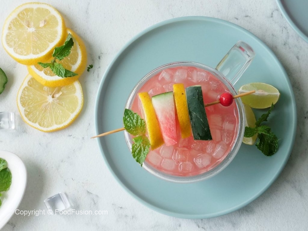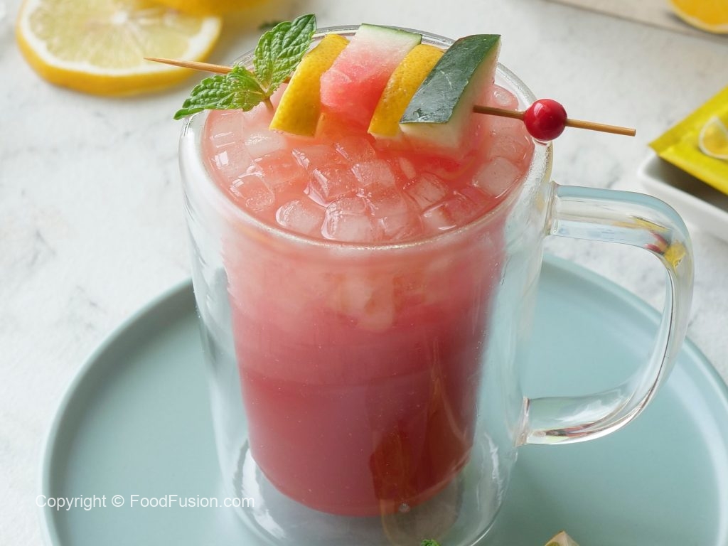 Blender mein watermelon,kheera,lemon juice,shahad aur lemon green tea dal ker ache tarhan blend karein & strain ker lein.